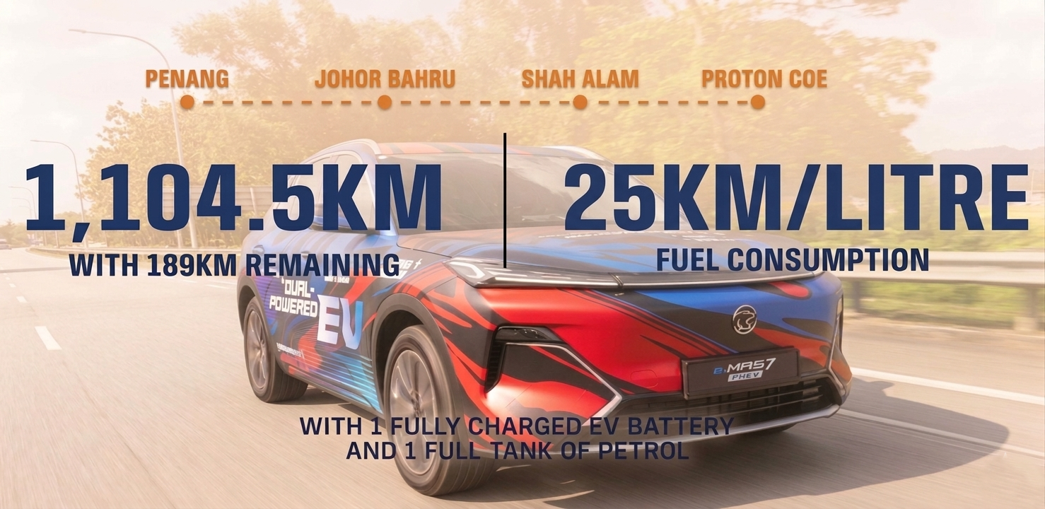 In fact, PRO-NET proved this ultra long range capability with a run that was livestreamed so the public could follow the journey up and down Peninsular Malaysia. Driven at normal cruising speeds, an e.MAS 7 PHEV travelled from Penang to Johor Bahru and back to the PROTON head office in Selangor, covering 1,104.5 kms (with fuel left for another 189 kms) without refuelling nor recharging.