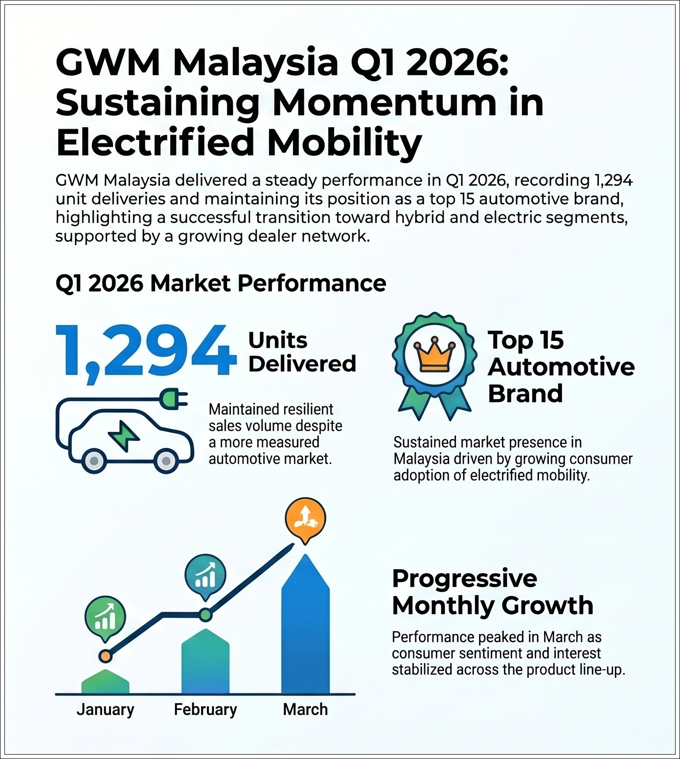 After a strong performance in 2025 with 177% growth over 2024, GWM Malaysia started 2026 with 1,294 vehicles delivered during the first quarter. While the initial months of the year saw a general moderation in buying activity (long festive holidays), the brand recorded a progressive improvement in sales that peaked in March as demand normalised.