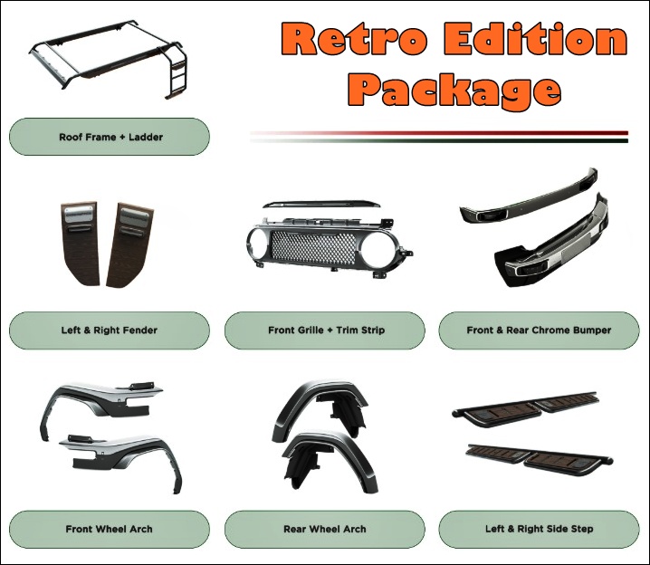 • The Retro Edition package adds a more classic off-road appearance with chrome bumpers, a chrome front grille, a roof rack with a side ladder, and unique side steps.
