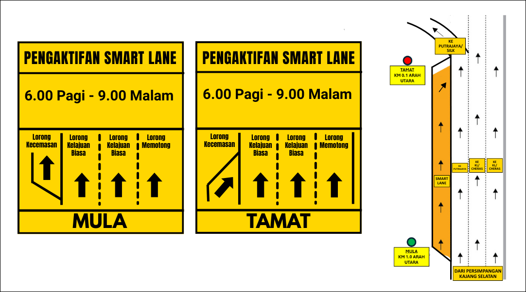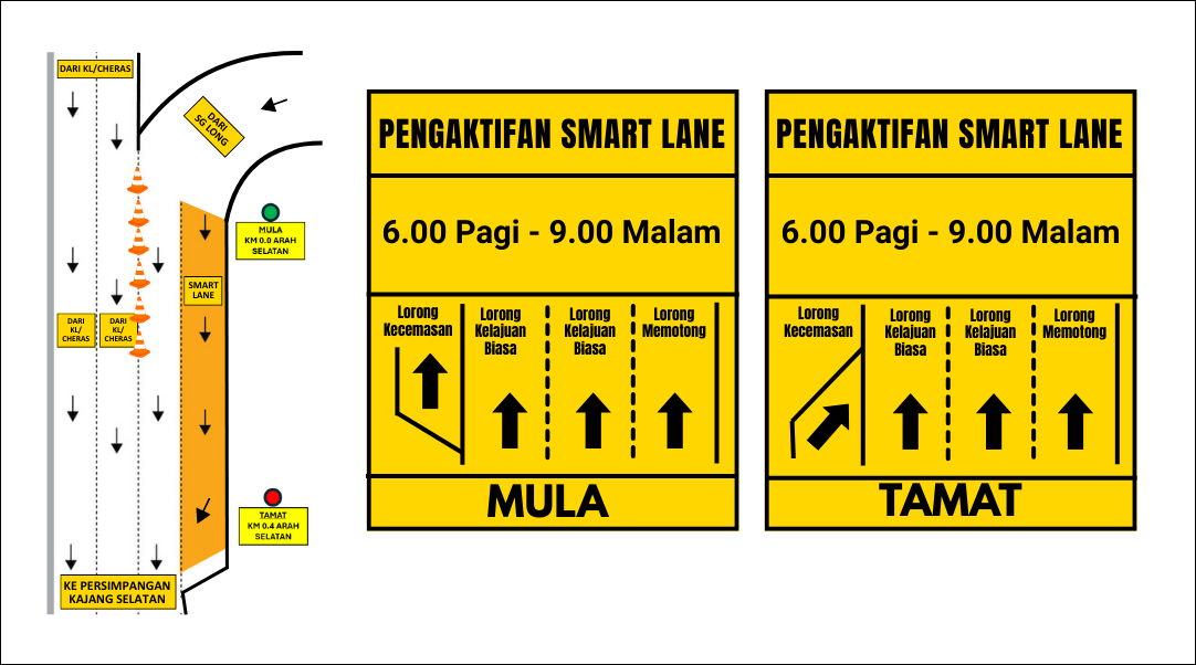 • Starting February 12, 2026, the emergency lane between the Kajang Selatan and Kajang Perdana interchanges will function as an extra travel lane daily from 6:00 am to 9:00 pm.