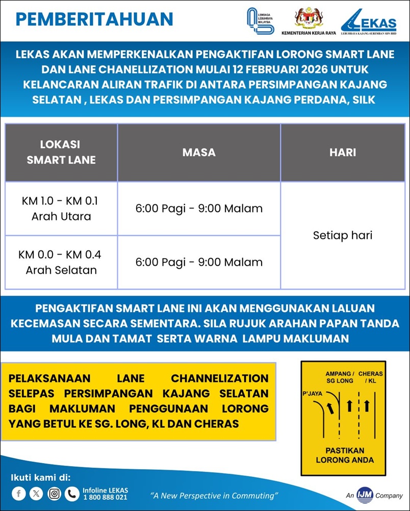 The implementation of this congestion mitigation plan will commence tomorrow, February 12, 2026. Smart Lane activation is strategically focused on two specific stretches between KM 1.0 and KM 0.4. The first section covers KM 1.0 to KM 0.1 northbound, facilitating traffic toward Putrajaya via the SILK Highway. The second section spans KM 0.0 to KM 0.4 southbound, aimed at easing congestion for those traveling from Sg. Long and Kajang Perdana back toward LEKAS.